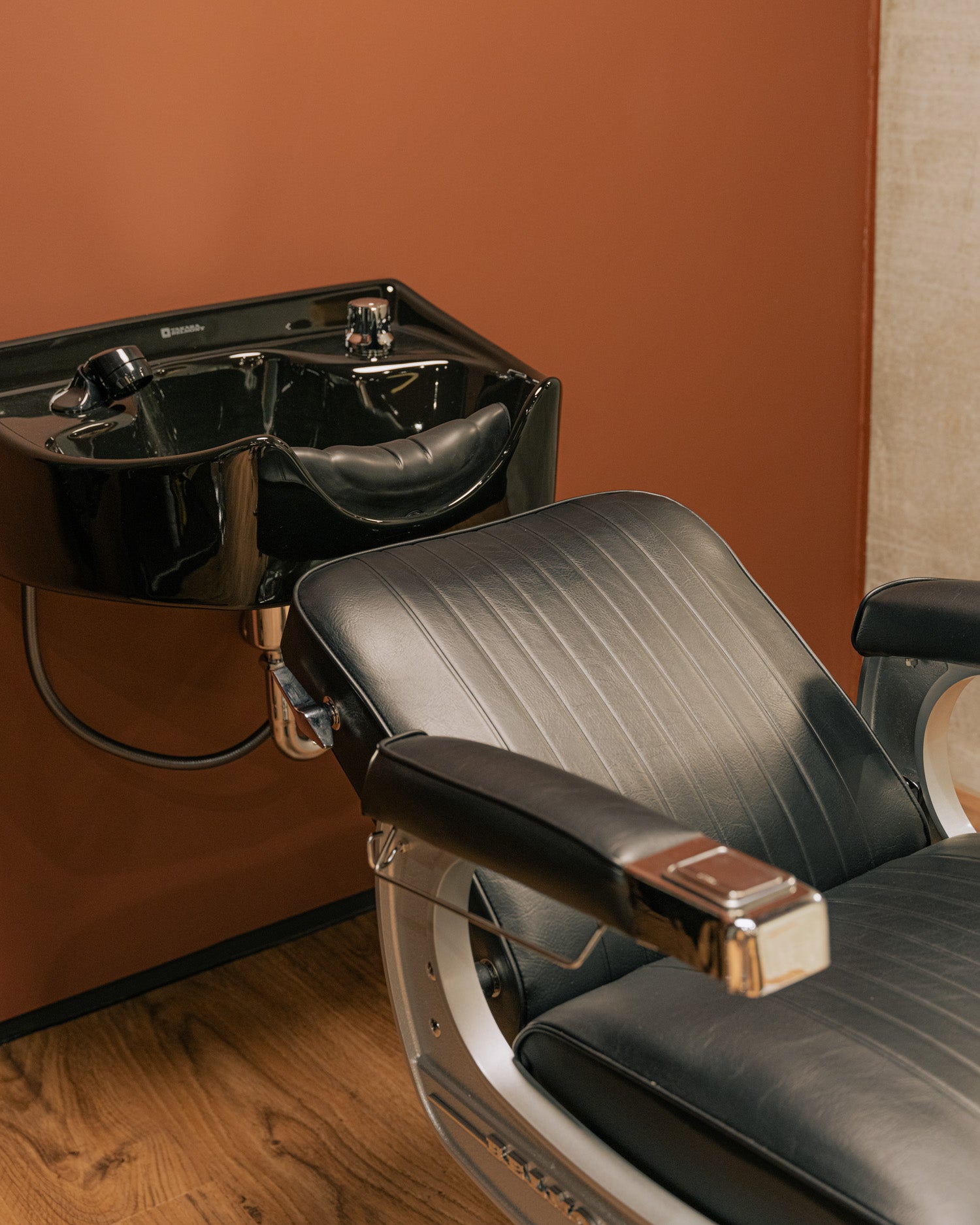 The Vintage skiller seg ut med sitt særegne design. Gulvet i rommet består av linoleum med et rustikt eikelook, noe som skaper en varm og innbydende atmosfære. Rommet kjennetegnes av en vegg i rå betong og dype mørkerøde vegger, som også går igjen i taket. Denne fargekombinasjonen og materialvalget gir en solid og maskulin stemning som kundene dine vil sette pris på, spesielt i forbindelse med mer tradisjonelle herresalonger og barbershops.